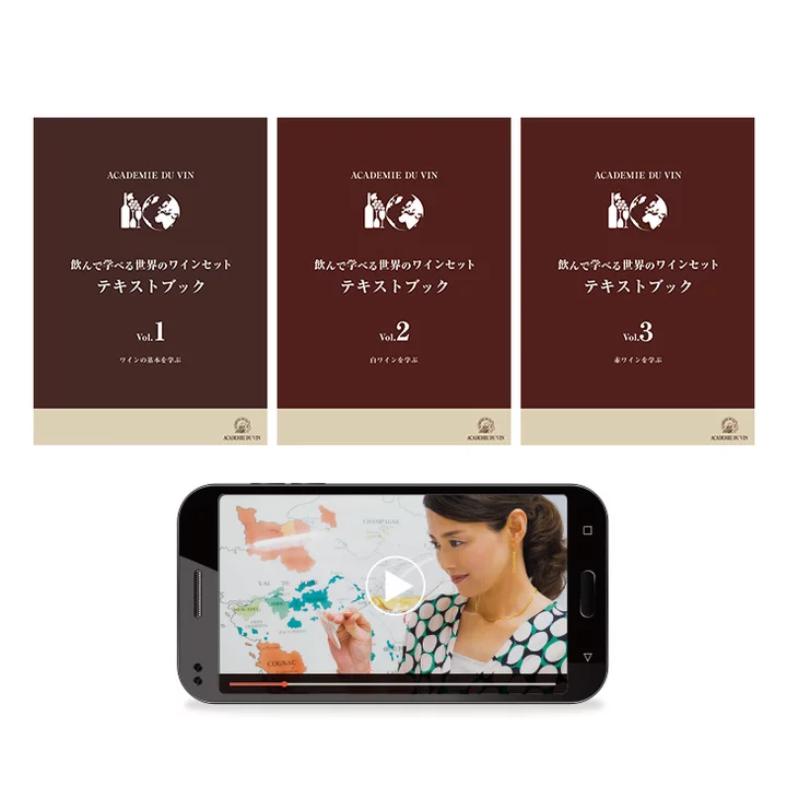 初心者の方にもわかりやすく解説した「テキスト」と人気講師による「オンライン動画」が付いていますので、ご自宅でワインスクールを受講しているような体験も!