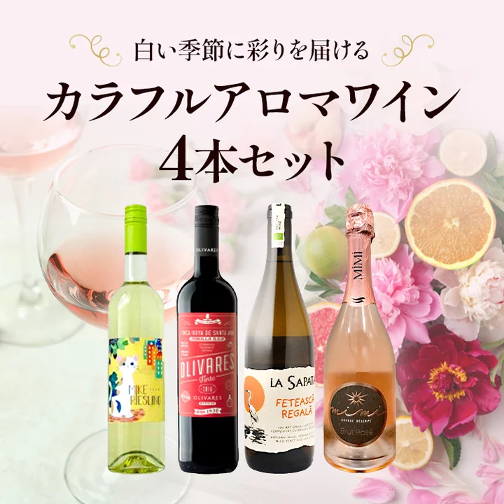 まだ冬の寒さが残るこの季節に、ひと足早く春の気配を感じさせるアロマティックなワイン4本をセレクトしました。グラスから立ち上るカラフルな香りは、まるで色彩を添えるように気持ちまでふわりと軽やかに。一本一本の個性豊かなアロマを味わいながら、ゆったりと楽しめるセットを特別価格でご案内いたします。