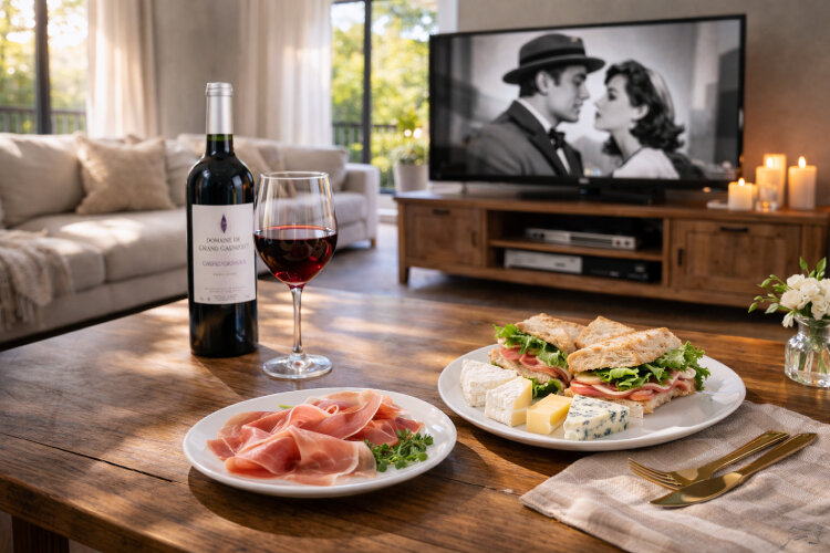リビングルームで映画を観ながら楽しむ昼ワインのひととき。